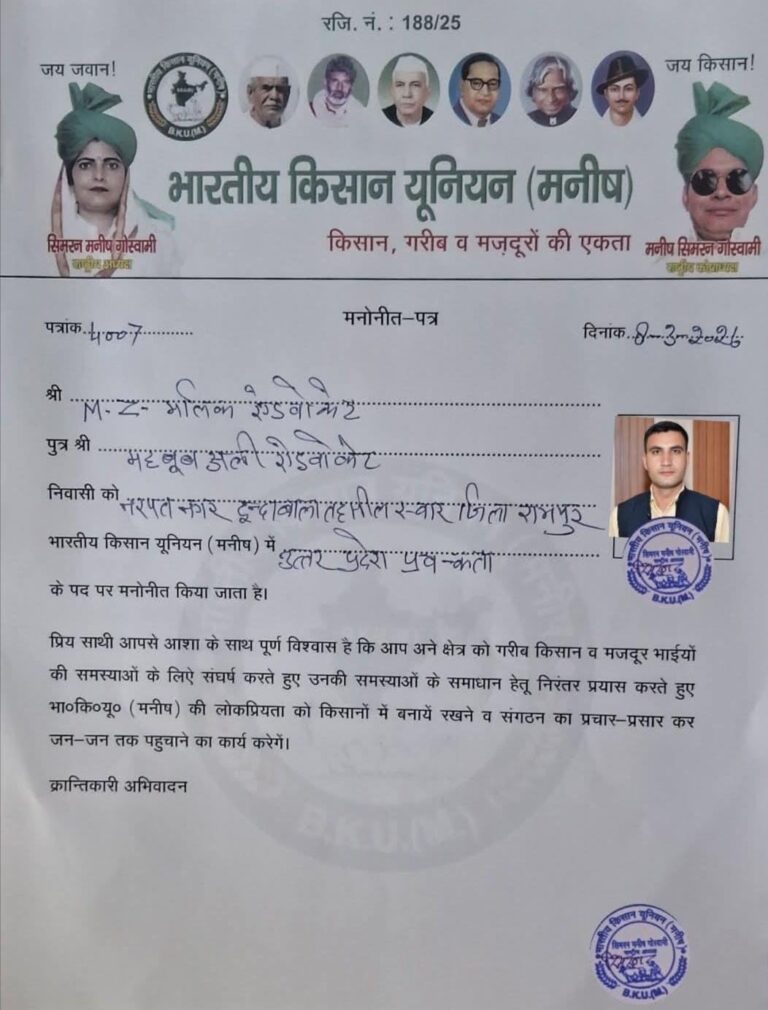 उत्तर प्रदेश के जनपद रामपुर की स्वार तहसील के युवा अधिवक्ता एवं चर्चित समाजिक कार्यकर्ता एम जिया मलिक एडवोकेट को भारतीय किसान यूनियन मनीष की राष्ट्रीय अध्यक्ष सिमरन मनीष गोस्वामी ने उत्तर प्रदेश का प्रवक्ता नियुक्त किया है,आपको बता दें भारतीय किसान यूनियन मनीष रजिस्ट्रेशन नंबर 188/25 गरीब किसान मजदूर एकता का एक पंजीकृत संगठन…